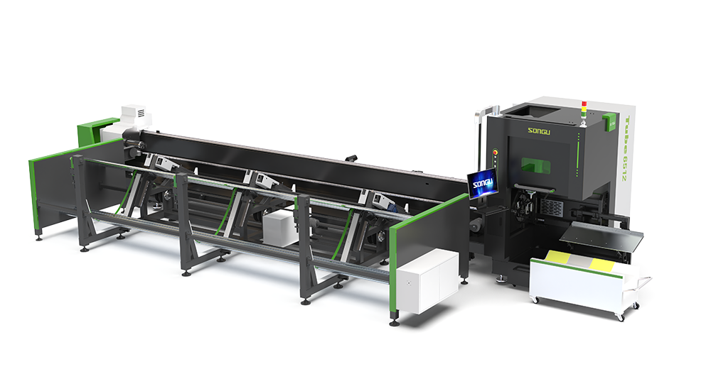 松谷激光科技Tube 系列全自動上料光纖激光切管機,聯排雙工位設計,雙頭可獨立切割相同或不同形狀的型材,上層成捆儲料下層自動送料和收料,應用于:碳鋼管激光切割,不銹鋼管激光切割;